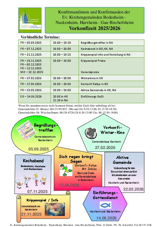 Der Konfirmandenunterricht findet wöchentlich dienstags in zwei Gruppen statt. Unterrichtsort ist im Wechsel das ev. Gemeindehaus Harxheim, Bahnhofstraße 11, und das ev. Gemeindezentrum Nackenheim, In den Haferwiesen 2.