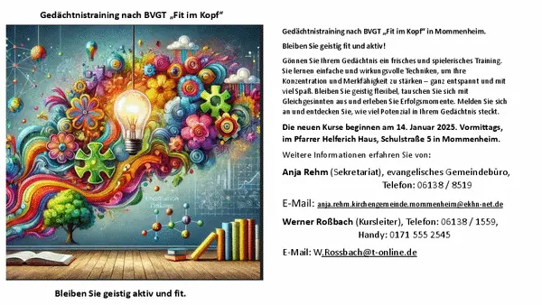 Nähere Auskünfte erteilt der Leiter der Kurse, Werner Roßbach (Tel.: 06138 – 1559 oder w.rossbach(at)t-online.de) sowie das Ev. Pfarramt, Anja Rehm (Tel.: 06138 - 8519 oder anja.rehm(at)ekhn.de).